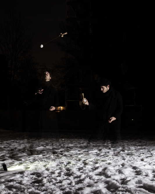 - 042 “Winter Lightning Drop” ( Switzerland) this photo was self shot, in the night, with my Iphone to light my feet so I can see the kendama and land the trick. remote controle in my other hand to trigger the flash 2 times during 8″ exposure.