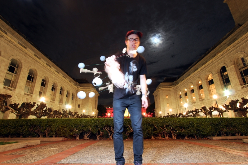 For Kendama Action I wanted to capture multiple points of action within one frame. In this picture of Matt Rice doing a tornado in front of San Francisco City Hall I have captured the movement and full cycle of the trick within one shot. Please note that this is all in camera and no photoshop was used for this effect. I set my camera for a long expsure to capture the buildings, plants, and the moon. As the shutter is open I fire a flash multiple times to freeze the subject in different positions. This creates the effect in the photo.