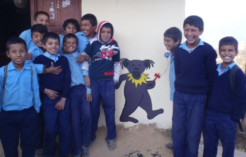 - 053 “Spread the love.” (USA) We painted this dancing bear playing Kendama on a primary school in Nepal. I left my Kendama there with these kids simply to spread the love… and the kids could shred the dama.