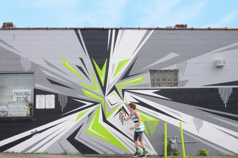- 075 “For the Love of the Game” (USA) Photo of me doing a double swing to spike in front of the artwork of two local graffiti writers.